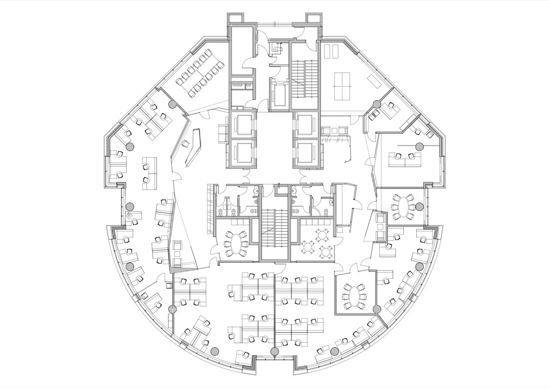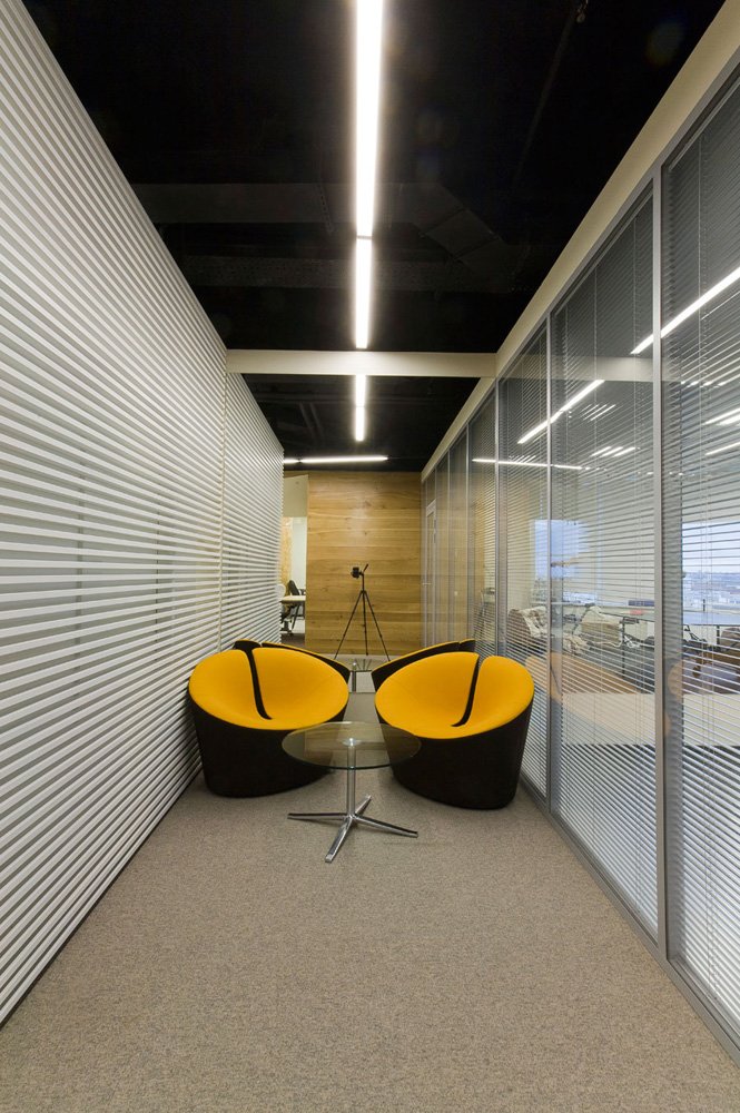 該場地呈方正矩形,因此設(shè)計圍繞中心使用功能而布局。首先必要的功能是衛(wèi)生設(shè)施,然后是其它必備的空間比如廚房與咖啡間,這些功能空間都有對水的需求。布局上,設(shè)計師保留了建筑原有的框架,不同的房間沿著走廊串了起來,透明的玻璃內(nèi)墻使整個空間變得柔和,橙色涂料的使用則為黑白灰的整體風格增添了一絲明快。走廊頂面從視覺上比實際層高要高些,工作區(qū)吊頂采用影院級的吸音材料,以減低環(huán)境噪音。互聯(lián)網(wǎng)線以及電線管道隱藏于架空地面,上面覆以地毯,這樣便于網(wǎng)絡(luò)的接口。雖然平面呈矩形,但在立面的處理上采用動態(tài)的斜面,以此豐富空間形態(tài)。