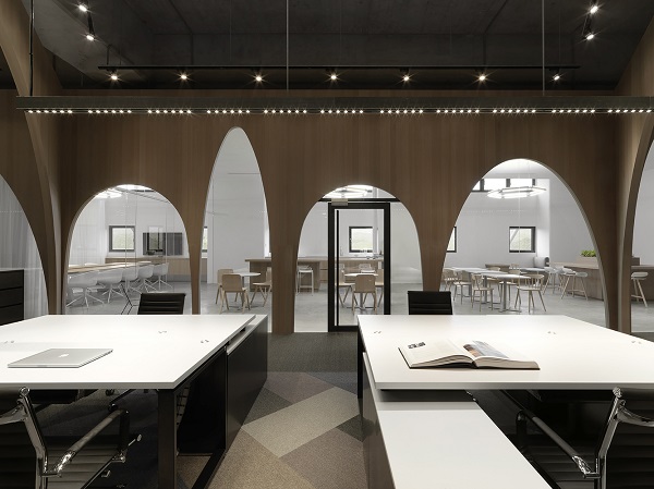2、考慮到辦公室裝修需要的空間性。設(shè)計師結(jié)合自身創(chuàng)意,設(shè)計了一個個用柱子支撐的空間結(jié)構(gòu),就像巴黎教堂的穹頂一般。巨大的柱子帶來的大跨度和場地的高屋頂以及隨處可見的鏡面和玻璃隔板,創(chuàng)造出一個兼具創(chuàng)造性和實用性的辦公室空間。整個辦公室設(shè)計被稱為“修道院”,包括一個L型的大廳,周圍的拱廊,一面面對建筑的室內(nèi)并且可以遠(yuǎn)望的庭院。通過創(chuàng)造人體尺度的辦公空間小組和放松的其他區(qū)域,這項辦公室設(shè)計既滿足了辦公所需的私密性,同時又保持了一種中性的工作環(huán)境。
