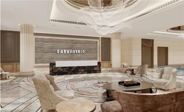 如某公司辦公室大廳設(shè)計以現(xiàn)代大氣為基調(diào),雙層挑高大廳以大理石拼接直通到頂,金屬色不銹鋼鑲嵌修飾,氣勢恢弘。