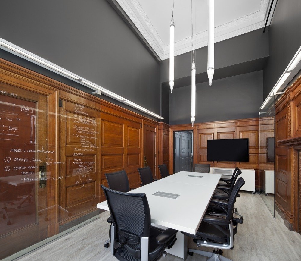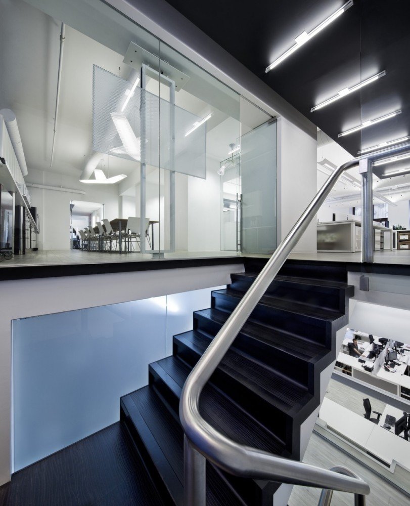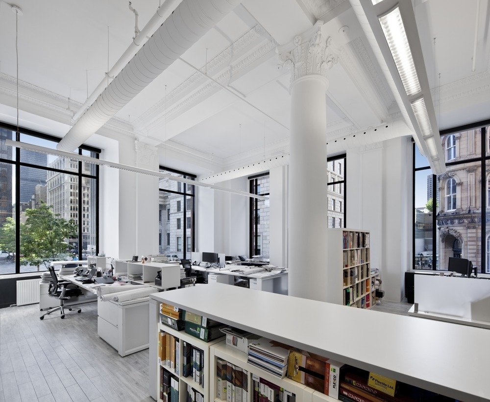 設(shè)計(jì)通過(guò)對(duì)橫向與豎向的空間微妙把握,傳達(dá)出將過(guò)去與現(xiàn)在結(jié)合在一起的建筑美學(xué)。室內(nèi)的改造清除之前翻修時(shí)增加的所有隔墻,以恢復(fù)空曠的建筑空間。室內(nèi)僅以優(yōu)雅的家具陳設(shè)來(lái)點(diǎn)綴建筑空間??諘绱髲d內(nèi)的每個(gè)工位除了讓員工擁有獨(dú)立的工作空間更是為了促進(jìn)組員間的工作交流,臨時(shí)會(huì)議區(qū)就近設(shè)在員工工位旁。整個(gè)樓面由開(kāi)放空間組成,以此來(lái)強(qiáng)化建筑自身的結(jié)構(gòu)美感:華麗的柱式和頂面,裝飾線條與木飾面。銀行的金庫(kù)位于一樓,現(xiàn)用于圖書(shū)室。