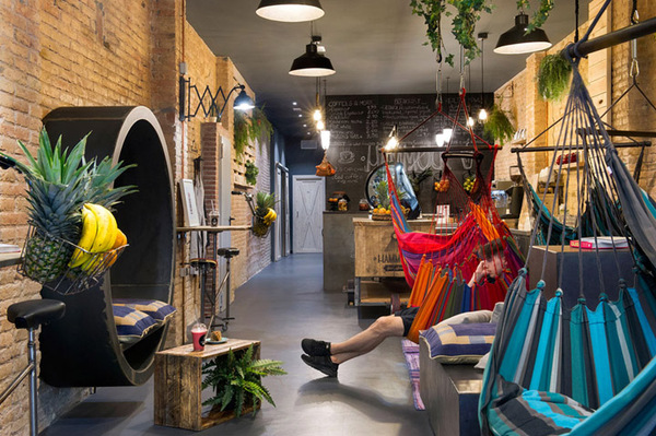 多彩的吊床由植物染色纖維制成、如皇冠一般組合懸掛的綠植;未經(jīng)修飾的粗糙磚墻與光滑的防銹鐵件形成材質(zhì)上的對(duì)比;拋光混凝土地面映襯著鮮綠與溫暖的質(zhì)感。
