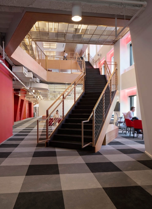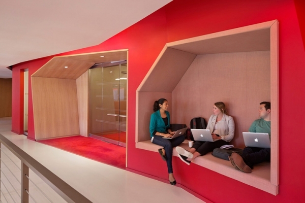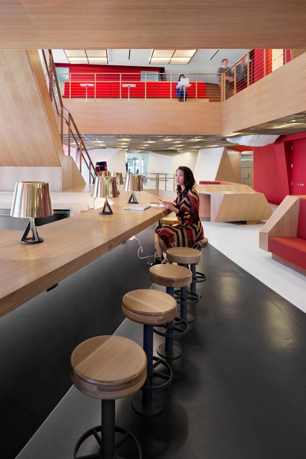 其它特殊功能區(qū)包括開闊的中庭、休閑區(qū)、咖啡吧、酒館式空間等,這樣的設(shè)計(jì)旨在促進(jìn)大家更多的聚集和互動(dòng)交流,增加內(nèi)部的凝聚力,培養(yǎng)文化和知識(shí)的共享理念。