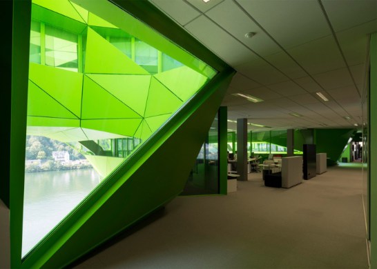 近來(lái),法國(guó)里昂海港區(qū)出現(xiàn)了一幢披著綠色外衣的大廈,它就是歐洲主流媒體之一的EuroNews新總部大樓。輕型的釉質(zhì)幕墻,覆有不規(guī)則的多孔鋁制包層。來(lái)源于河水顏色的靈感,讓綠色滲透到了辦公室的“骨血”中。