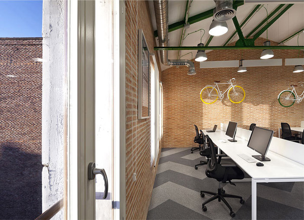 設(shè)計師在辦公區(qū)域的設(shè)計上,采用了壁掛式的自行車作為點綴,自行車的一種人力機械之一,它是由許多簡單機械組成的復(fù)雜機械。