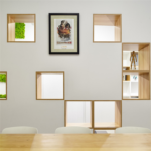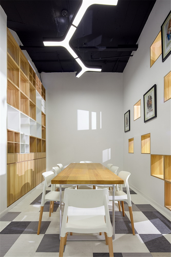 作為舊辦公室翻新設(shè)計(jì),設(shè)計(jì)師首先通過調(diào)整辦公室格局、整合自然光與人工光源,一掃之前的沉悶和陰暗,有效提升了空間的舒適度。周圍的小型辦公室后移,與放大后的中央辦公區(qū)域進(jìn)行光源共享,同時(shí)將白色作為底色,引入南側(cè)窗外的自然光,加之屋頂?shù)腨型吊燈、射燈等立體的人造光,大面積的辦公空間被瞬間點(diǎn)亮,整個(gè)辦公室明朗通透,舒適宜人。