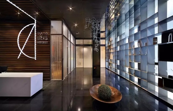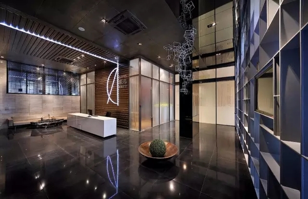 前臺對面的墻面處,擺放著一個傳統(tǒng)中式的柜體,黑色的大漆外表點綴著赤色的朱砂,體現(xiàn)出骨子里的我國精力以今世的審美視覺體現(xiàn)東方的空間氣質(zhì)。