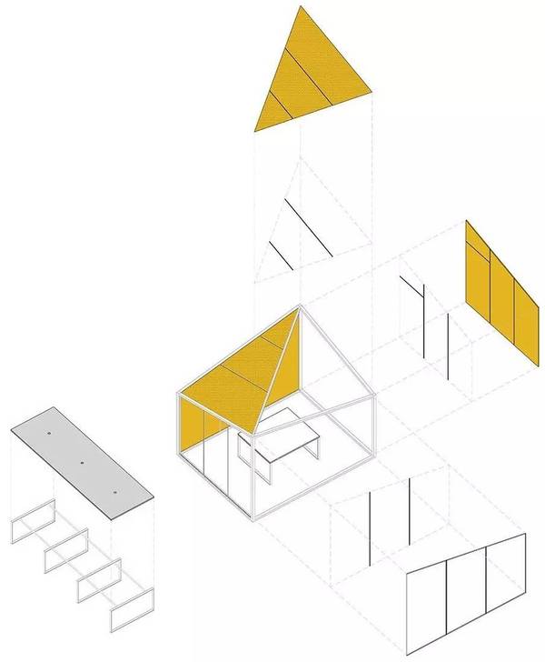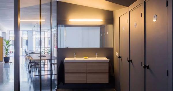 正交排布的網(wǎng)狀結(jié)構(gòu)體系和模塊化的立面相結(jié)合使中間的區(qū)域比兩邊要窄,為布置兩個(gè)相似的辦公室制造了難度。建筑師決定在空間中插入三個(gè)塊狀空間,其中兩個(gè)用于會(huì)議,另一個(gè)用作衛(wèi)生間。其獨(dú)立于原有空間存在,使空間更有層次和秩序感。