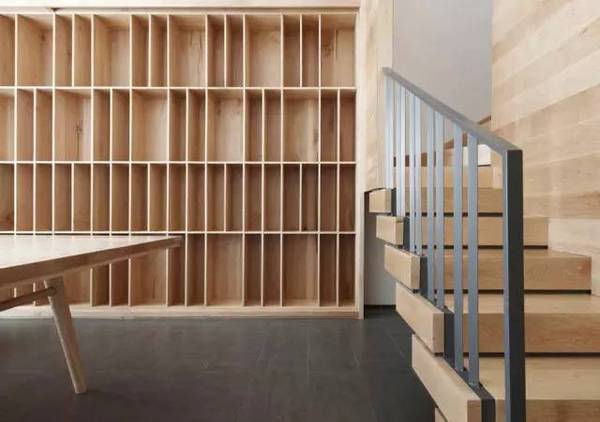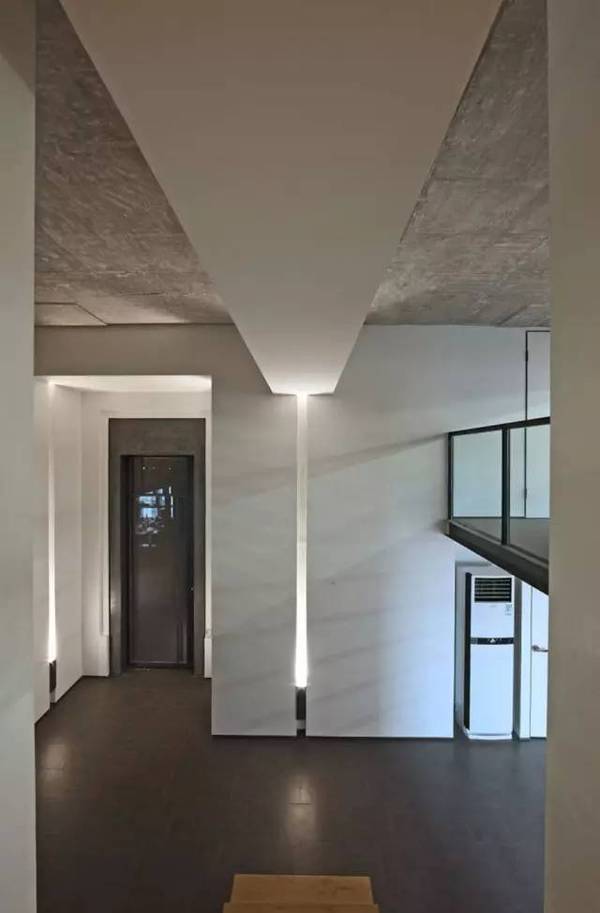挑高的入口門廳中,地面運用了灰色仿古磚,原本白色的天花板表皮被鏟掉,露出原有的混凝土表情,打砂的方式使天花板既達到防塵的效果,又擁有特殊的細膩肌理。門廳中央為兩道白墻,白墻中間的細縫夾著一道窄窄的無扶手樓梯。這個看似冒險的設計實際上解決了屋頂建筑橫梁帶來的對閣樓人員流通的阻礙問題。