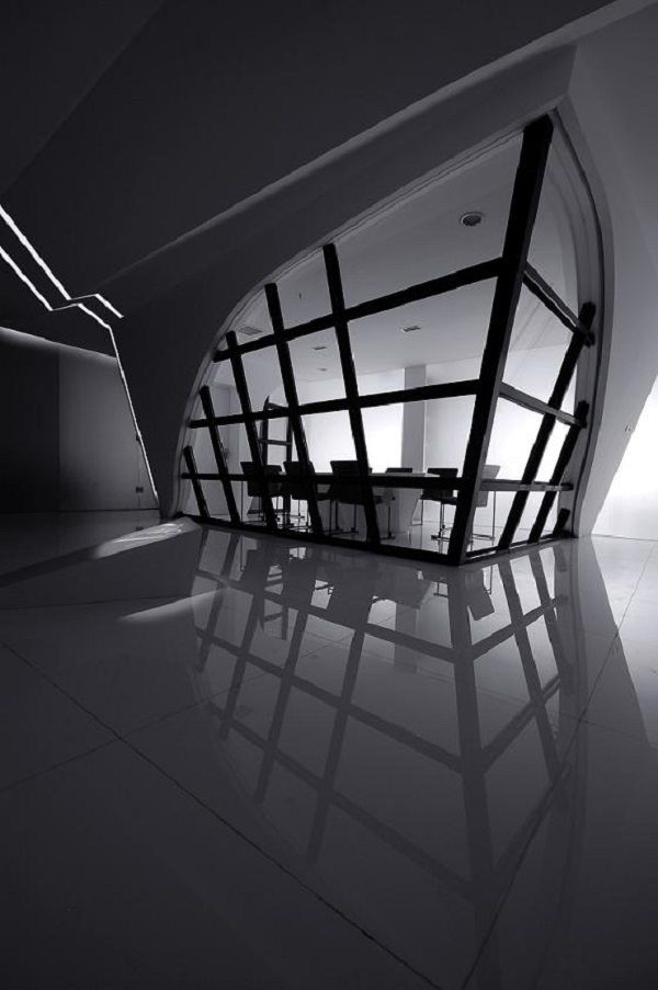 看到這個會議室,你會聯(lián)想到什么?領(lǐng)企小編我首先想到的是船頭。船頭是劈開大海波浪,帶領(lǐng)船身乘風(fēng)破浪向前進(jìn)的地方。把會議室裝修成船頭恐怕也是這個用意吧。辦公室設(shè)計大量運(yùn)用灰色的原因恐怕就是灰色是無彩色,即沒有色相和純度,只有明度,使用灰色能夠為了突出這里的結(jié)構(gòu)設(shè)計了吧。