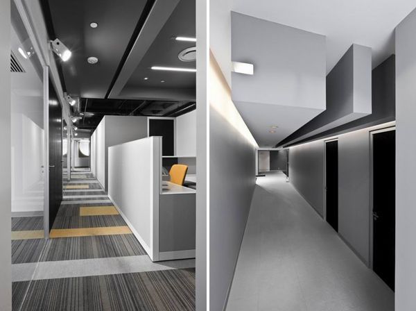 辦公室設(shè)計的辦公區(qū)域和走廊,灰色也不會顯得單調(diào)?;疑梢允堑匕?,作為整個空間的輔助;也可以是主體,就像兩側(cè)墻壁上明暗不同的灰色組成的圖畫,吸引眼球。