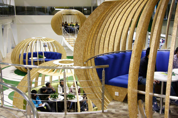 而關(guān)于大家**奇的,除了它本身的膠囊造型之外,就是這些“鳥籠”的材質(zhì)了;這些坐落于竹木地板上的“未來對(duì)撞機(jī)”,用麥秸板——一種可再生的農(nóng)業(yè)材料,秉承可持續(xù)發(fā)展的健康辦公環(huán)境的創(chuàng)新理念,這也是在2010年上海世博會(huì)展館使用的主要材料。100%優(yōu)質(zhì)原材料的麥秸板,采用無甲醛膠粘劑(P-MDI)通過熱壓工藝低碳、環(huán)保、健康。因?yàn)槭恰傲隳尽辈牧?,還有助于減少森林砍伐,這反過來又進(jìn)一步的積極影響我們呼吸的空氣質(zhì)量??偠灾?,這樣的辦公室裝修設(shè)計(jì)無論是在環(huán)保上還是實(shí)用上都給我們做出了很好的表率。
