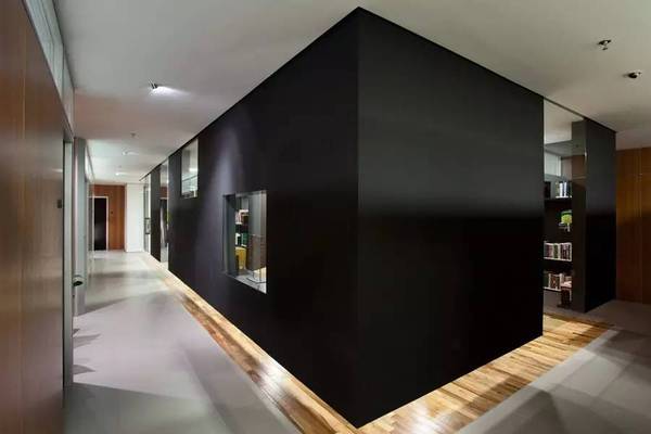 這是為律師事務(wù)所設(shè)計(jì)的室內(nèi)空間,空間包含兩層,有著清晰的格局:一層較大,負(fù)責(zé)公司運(yùn)行,另一層則較小,負(fù)責(zé)會(huì)議和管理。一旦這兩層被明確地分為功能層和公共活動(dòng)層,設(shè)計(jì)想要展示公司理念的任務(wù)就落在了第一層上。鑒于此,設(shè)計(jì)呈現(xiàn)出放射式的空間分布方式,每個(gè)會(huì)議室都位于邊緣地帶,有室外的景色和自然照明,而被環(huán)繞在中心的是一個(gè)巨大的圖書室,它組織通向各個(gè)房間的流通系統(tǒng)。