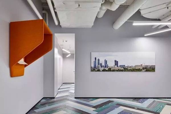 辦公場(chǎng)地的前身是一個(gè)停車(chē)場(chǎng),頂面有著眾多龐雜的管道系統(tǒng)。設(shè)計(jì)師的解決方法是首先把整個(gè)室內(nèi)空間全部噴成白色,包括所有的孔隙、格子以及頂面眾多的機(jī)電管道。清一色的白色噴涂令原本雜亂無(wú)章的空間成為一個(gè)干凈明亮的視覺(jué)整體。隨后,設(shè)計(jì)師為這個(gè)純凈的空間注入他們?cè)诒景杆磉_(dá)的創(chuàng)意主體和色調(diào):漂亮的地面設(shè)計(jì)。采用仿木地板的瓷磚,分別制作成藍(lán)色、灰色、綠色、白色、黑色,幾組色彩以人字紋交錯(cuò)排列,在偌大的空間里形成**動(dòng)感和視覺(jué)魅力的空間效果。
