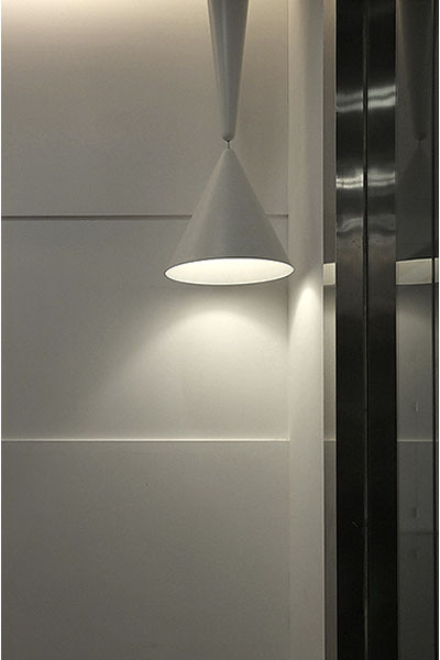 墻面的錯格設計非常有層次感,簡單的設計并非沒有看點,設計師改變環(huán)境外觀的方法手段數(shù)不勝數(shù);但是能通過極為簡單的手法讓環(huán)境從簡樸中透漏出深厚的內涵,這就是一件比較考驗技巧的事情。而圖中的圓錐造型吊燈,便是這一空間設計的亮點所在.