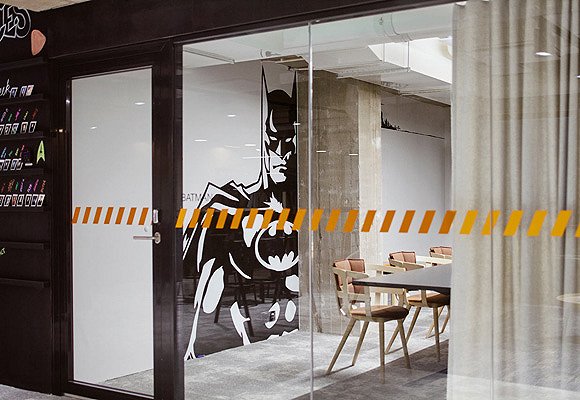 背景墻設(shè)計(jì)里有很多蝙蝠俠、綠巨人、超人等影視漫畫元素。