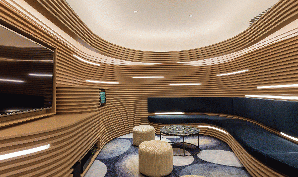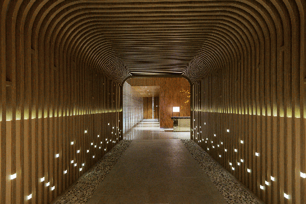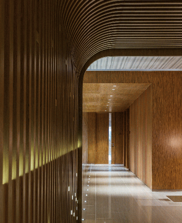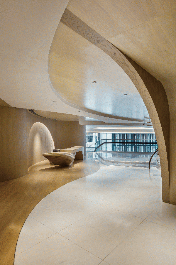 會所內(nèi)的木材不僅僅是結構性的支持,起伏有致的輪廓劃分出不同區(qū)域,優(yōu)雅的弧線跨越寬敞的空間與柔和的燈光產(chǎn)生巧妙的相互作用。豐富的線條增強空間的立體感而不失悠閑的舒適享受,精妙的雕塑元素糅合簡約的燈光折射及滲光燈槽,整體干凈利落,構筑出精美雅意而富藝術感的視覺效果,凸顯設計師細膩的設計考量。