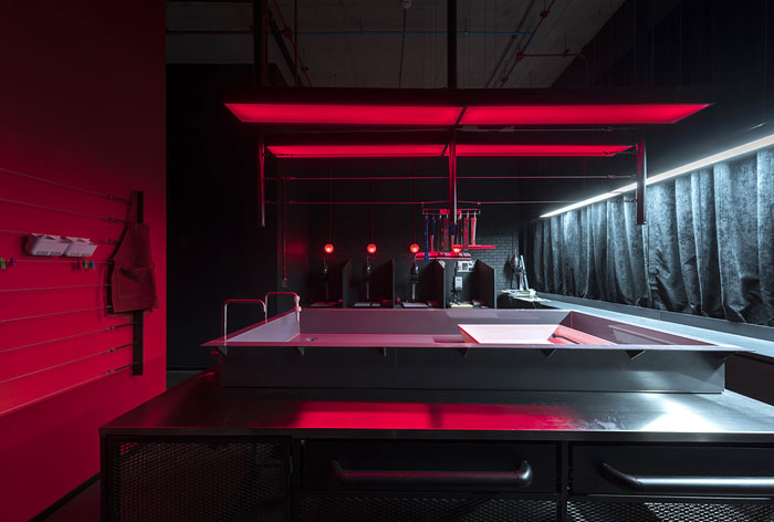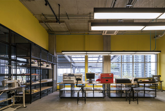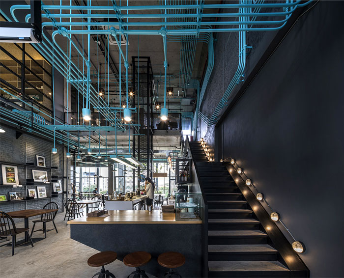 整個(gè) Co-Working Space 面積寬敞,以工業(yè)廠房的形式接待著來(lái)訪的客人,稍經(jīng)修飾的地面與裸露的混凝土立柱,帶來(lái)*為原始、粗獷的空間魅力,一層為咖啡廳,從售賣各種食品的吧臺(tái)到充滿工業(yè)感的桌椅,很難將它與工作空間聯(lián)想到一塊。
