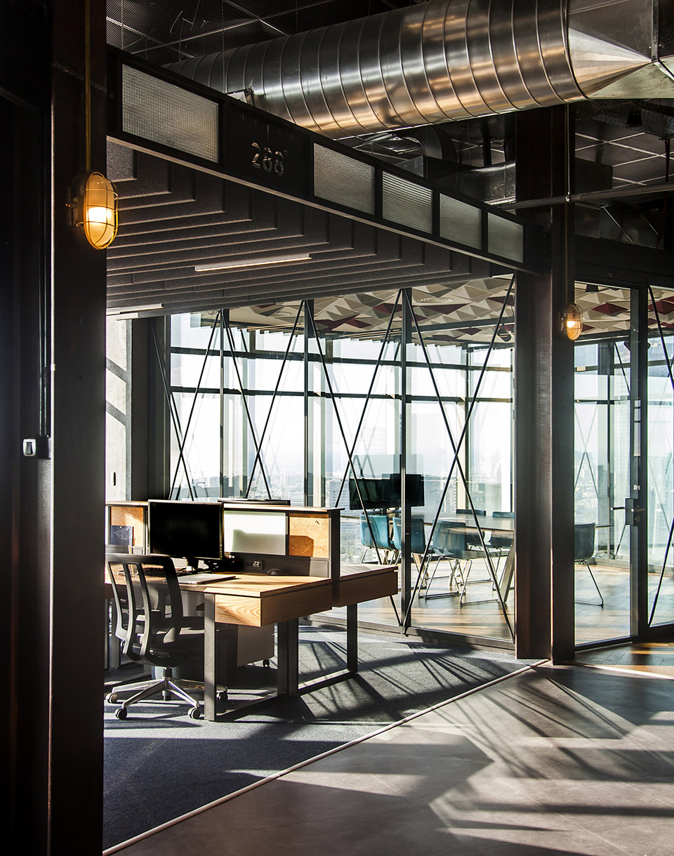 粗糙的原木、不加修飾的混凝土核心筒墻體以及銹色的金屬結(jié)構(gòu)凸顯了這個(gè)辦公空間的工業(yè)氣息?!扒擅畹卦O(shè)計(jì)讓位于城市中心的辦公空間能夠與公司所有數(shù)據(jù)的來源 – 船只發(fā)生了聯(lián)系。我們有意避免了讓人能夠聯(lián)想起豪華游艇的任何元素,而是渲染出一種如同工業(yè)港口般的粗糙氛圍?!笔聞?wù)所創(chuàng)始人Roy David解釋道。