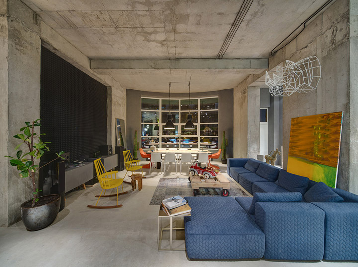 設計師盡量不去改變原有墻體構造,并完全保留原有的水泥墻和水泥頂板。自然原始的材質表面在藝術品的襯托下反而呈現出自然樸素的美感。頂面的管道布線經過仔細編排,為原本平淡無趣的頂面增添了許多設計美感。